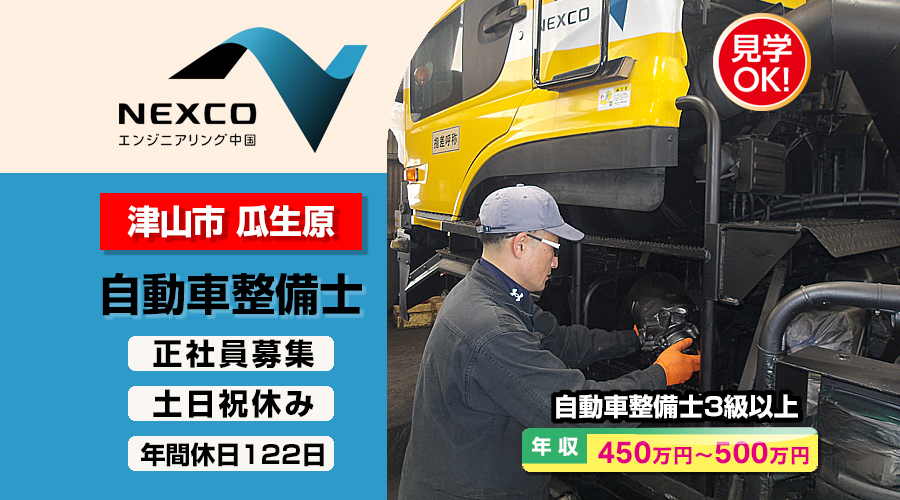 自動車整備士3級以上求人!年収450万円以上!岡山県津山市瓜生原 西日本高速道路エンジニアリング中国株式会社 転職採用情報!給料・環境・社会保険充実!
