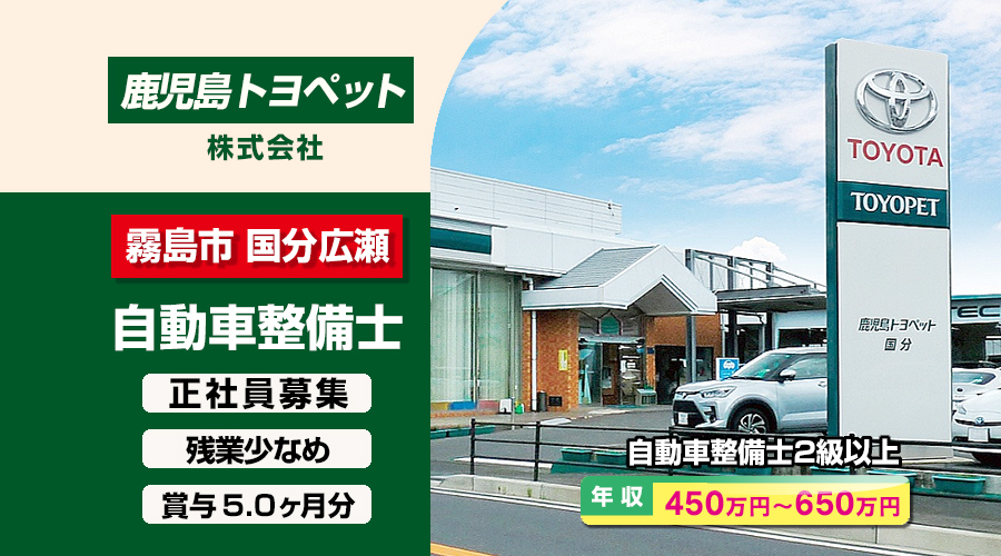 自動車整備士2級以上求人!年収450万円以上!鹿児島県霧島市国分広瀬 鹿児島トヨペット株式会社 転職採用情報!給料・環境・社会保険充実!
