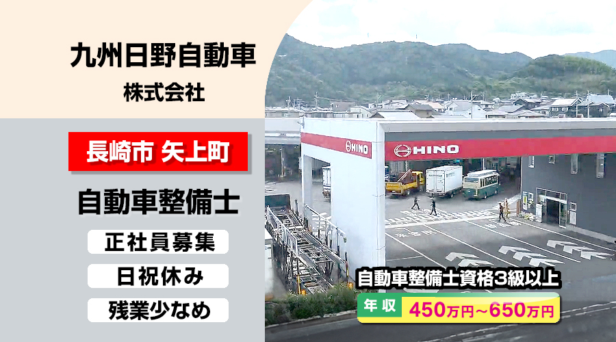 自動車整備士3級以上求人!年収450万以上!長崎県長崎市矢上町 九州日野自動車株式会社 転職採用情報!
