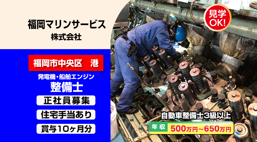 自動車整備士資格3級以上求人!年収500万円以上!福岡県福岡市中央区 福岡マリンサービス株式会社 転職採用情報!給料、職場環境も安心。社会保険完備!